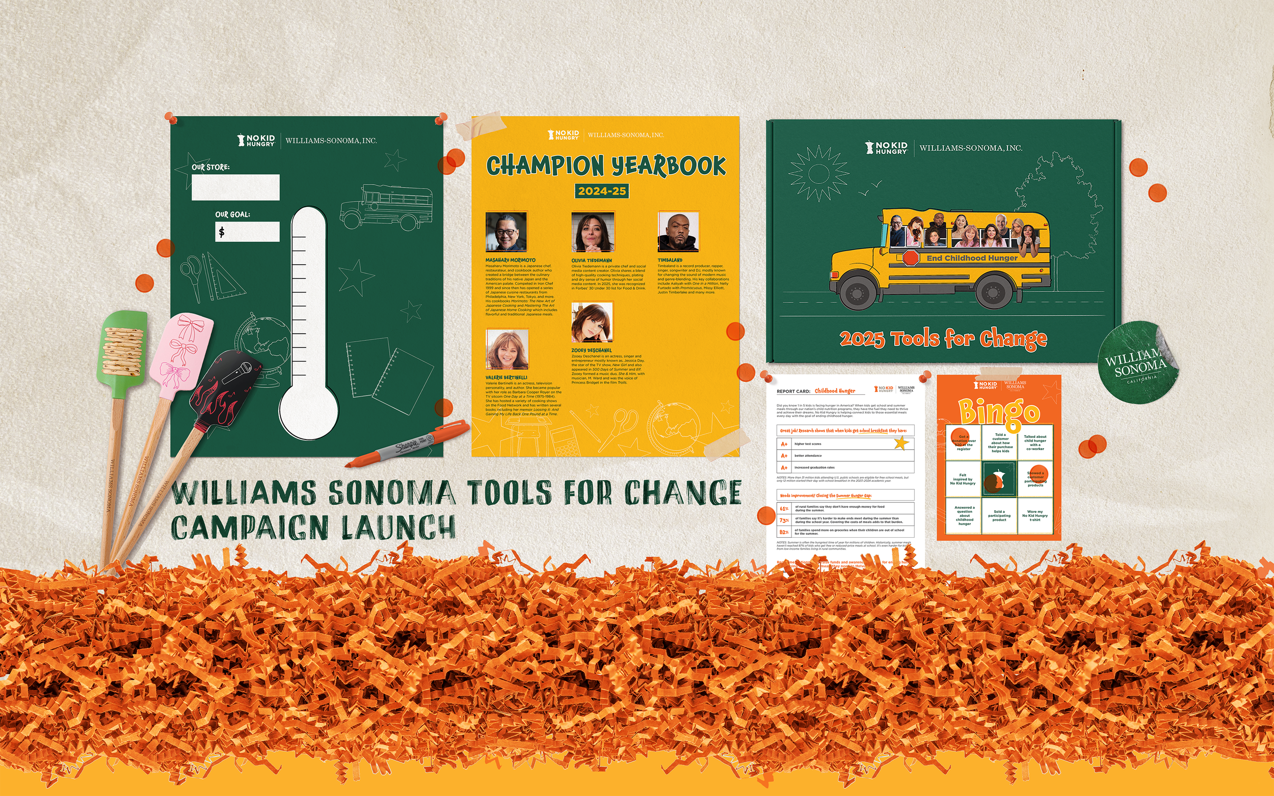 The Tools for Change look and feel consisted of nostalgic, blackboard chalk graphics and a marker-esque font, paired with the No Kid Hungry campaign’s most identifiable colors. The icons featured in the designs are variations of the bespoke icon library I created for the No Kid Hungry campaign in 2022, toned down to match the refined style of Williams Sonoma.